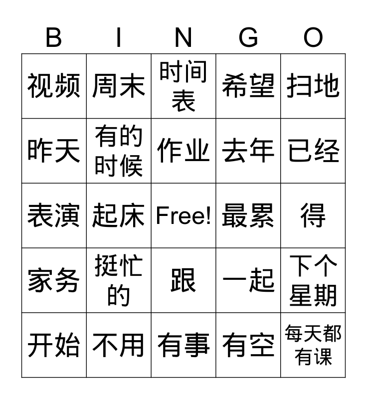 This bingo card has a free space and 29 words: 开始, 睡觉, 起床, 才, 视频, 时间表, 有的时候, 挺忙的, 最累, 不用, 得, 每天都有课, 有事, 有空, 已经, 一样, 跟, 家务, 扫地, 表演, 一起, 上个月, 去年, 昨天, 希望, 周末, 下个星期, 作业 and 做菜.