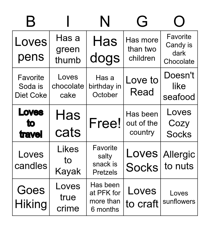 This bingo card has a free space and 24 words: Likes to Kayak, Loves true crime, Has a birthday in October, Goes Hiking, Favorite Candy is dark Chocolate, Loves pens, Favorite Soda is Diet Coke, Has a green thumb, Has been out of the country, Favorite salty snack is Pretzels, Love to Read, Loves to travel, Loves Socks, Allergic to nuts, Loves chocolate cake, Loves to craft, Loves Cozy Socks, Has dogs, Doesn't like seafood, Has cats, Loves sunflowers, Loves candles, Has more than two children and Has been at PFK for more than 6 months.