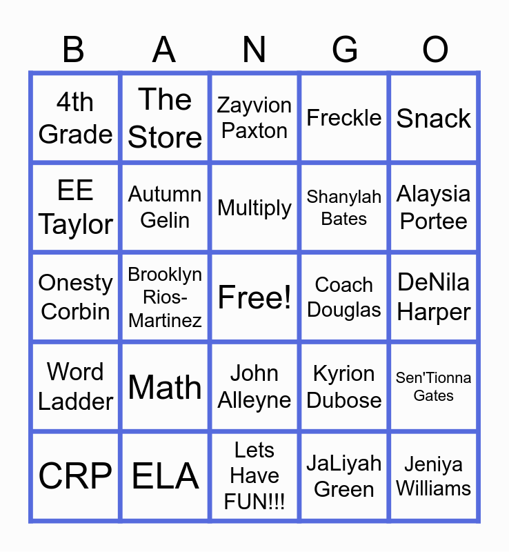This bingo card has a free space and 24 words: Math, ELA, Multiply, CRP, Snack, 4th Grade, EE Taylor, The Store, Coach Douglas, John Alleyne, Shanylah Bates, Onesty Corbin, Kyrion Dubose, Sen'Tionna Gates, Autumn Gelin, JaLiyah Green, DeNila Harper, Zayvion Paxton, Alaysia Portee, Brooklyn Rios-Martinez, Jeniya Williams, Word Ladder, Freckle and Lets Have FUN!!!.