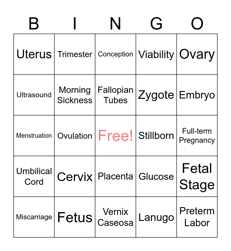 This bingo card has a free space and 24 words: Cervix, Fetus, Fallopian Tubes, Miscarriage, Ovary, Uterus, Ultrasound, Trimester, Stillborn, Placenta, Zygote, Menstruation, Glucose, Fetal Stage, Morning Sickness, Lanugo, Full-term Pregnancy, Conception, Embryo, Ovulation, Preterm Labor, Umbilical Cord, Viability and Vernix Caseosa.