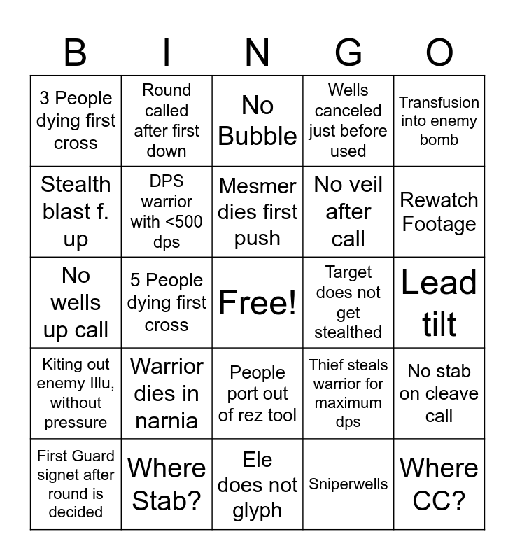 This bingo card has a free space and 25 words: Warrior dies in narnia, Ele does not glyph, Mesmer dies first push, First Guard signet after round is decided, Transfusion into enemy bomb, 3 People dying first cross, Stealth blast f. up, Round called after first down, Target does not get stealthed, People port out of rez tool, No veil after call, No wells up call, Thief steals warrior for maximum dps, No stab on cleave call, DPS warrior with <500 dps, First tilt, Lead tilt, No Bubble, Rewatch Footage, 5 People dying first cross, Where CC?, Where Stab?, Kiting out enemy Illu, without pressure, Wells canceled just before used and Sniperwells.