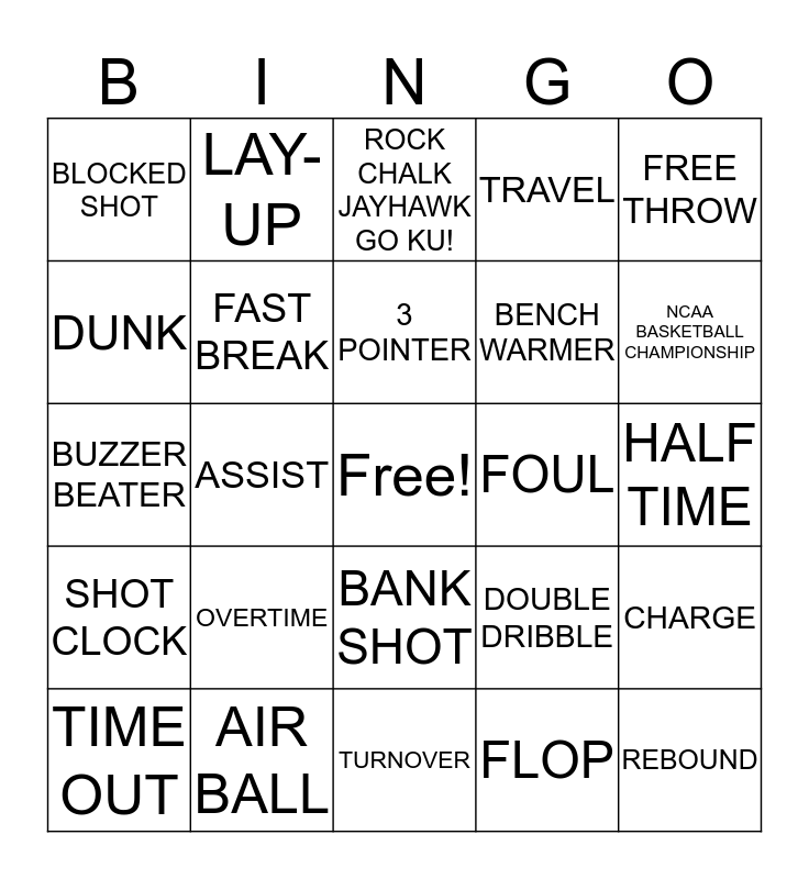 This bingo card has a free space and 24 words: OVERTIME, AIR BALL, 3 POINTER, TIME OUT, FREE THROW, BLOCKED SHOT, DUNK, LAY-UP, FOUL, BANK SHOT, BENCH WARMER, BUZZER BEATER, DOUBLE DRIBBLE, CHARGE, FAST BREAK, FLOP, HALF TIME, ROCK CHALK JAYHAWK GO KU!, NCAA BASKETBALL CHAMPIONSHIP, ASSIST, REBOUND, SHOT CLOCK, TRAVEL and TURNOVER.