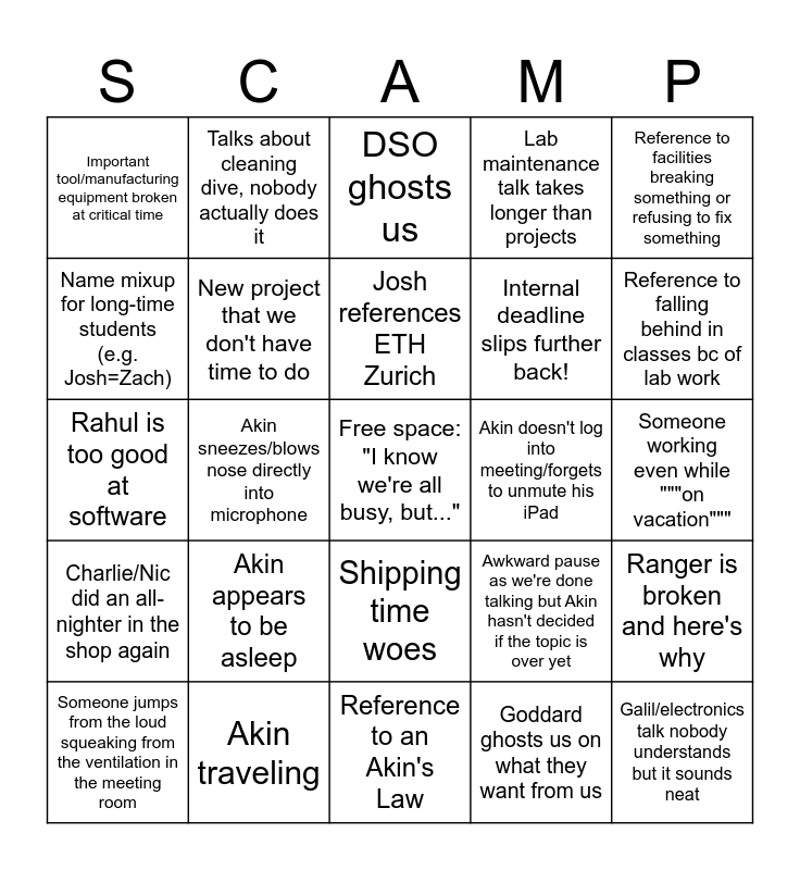 This bingo card has a free space and 46 words: "We need to get [this project we're all working overtime on] done by [deadline we all know]", Galil/electronics talk nobody understands but it sounds neat, Akin forgets software again, Reference to an Akin's Law, Akin appears to be asleep, Passive-aggressive shaming of lack of progress, Talks about cleaning dive, nobody actually does it, Relevant undergrad mysteriously absent, Name mixup for long-time students (e.g. Josh=Zach), Issue with the pool this week, New project that we don't have time to do, Lab maintenance talk takes longer than projects, Ranger is broken and here's why, Awkward pause as we're done talking but Akin hasn't decided if the topic is over yet, New undergrad abandons project, Request for Goddard bullets (that nobody's had time for), Josh references ETH Zurich, Akin doesn't log into meeting/forgets to unmute his iPad, Someone names a random part number that they absolutely should not know from memory, Reference to facilities breaking something or refusing to fix something, Akin sneezes/blows nose directly into microphone, Goddard ghosts us on what they want from us, Important tool/manufacturing equipment broken at critical time, Internal deadline slips further back!, Reference to/request for no-cost extension, Reference to falling behind in classes bc of lab work, Someone jumps from the loud squeaking from the ventilation in the meeting room, ML/neural network joke, Shipping time woes, Charlie/Nic did an all-nighter in the shop again, Storytime with Dave!, Mention of old lab member who graduated before anyone else arrived, Mysterious cross-project reallocation of $$$, Akin swears!, Misattribution of work to somebody else, Akin traveling, Someone working even while """on vacation""", Someone missed meeting to have life/partner/stuff that isn't robots, somebody's horribly sick but still called in!, Akin mentions Natalie leaving again, "How much money does this project have left?", DSO ghosts us, Rahul is too good at software, Dave starts a second Teams meeting despite another Teams meeting already existing, Truancy! and Romeo apologizes.