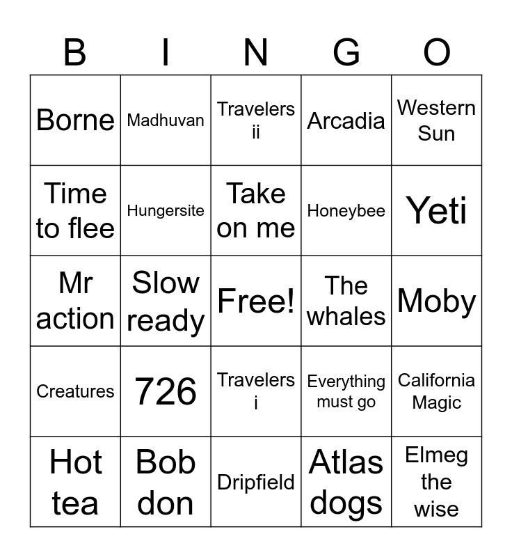 This bingo card has a free space and 24 words: 726, Bob don, Take on me, Hot tea, Western Sun, Borne, Time to flee, Madhuvan, The whales, Travelers i, Honeybee, Mr action, Everything must go, California Magic, Hungersite, Atlas dogs, Moby, Travelers ii, Yeti, Slow ready, Elmeg the wise, Creatures, Arcadia and Dripfield.