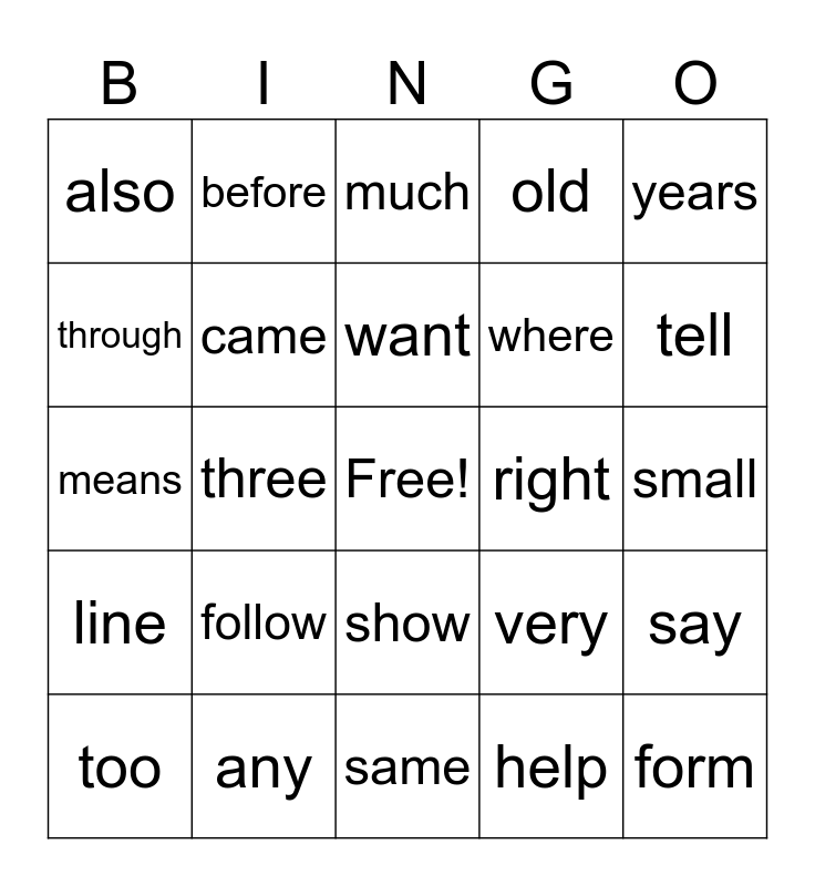 This bingo card has a free space and 28 words: say, great, where, help, through, much, before, line, right, too, means, old, any, same, tell, boy, follow, came, want, show, also, around, form, three, small, very, years and new.