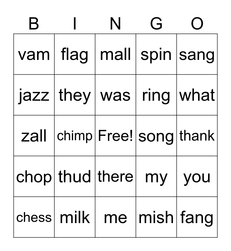 This bingo card has a free space and 29 words: chess, tank, chimp, fizz, vam, mall, they, thud, song, milk, thank, fang, me, mish, what, rock, there, chop, sang, zall, my, have, ring, jazz, spin, flag, you, was and want.