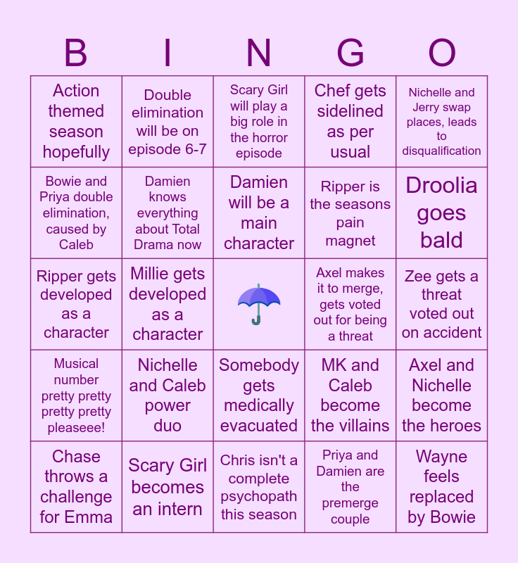This bingo card has a free space and 24 words: Nichelle and Caleb power duo, Scary Girl becomes an intern, Damien will be a main character, Chase throws a challenge for Emma, Nichelle and Jerry swap places, leads to disqualification, Action themed season hopefully, Bowie and Priya double elimination, caused by Caleb, Double elimination will be on episode 6-7, Axel makes it to merge, gets voted out for being a threat, Somebody gets medically evacuated, Ripper is the seasons pain magnet, Ripper gets developed as a character, MK and Caleb become the villains, Axel and Nichelle become the heroes, Damien knows everything about Total Drama now, Priya and Damien are the premerge couple, Zee gets a threat voted out on accident, Scary Girl will play a big role in the horror episode, Droolia goes bald, Millie gets developed as a character, Wayne feels replaced by Bowie, Musical number pretty pretty pretty pretty pleaseee!, Chef gets sidelined as per usual and Chris isn't a complete psychopath this season.