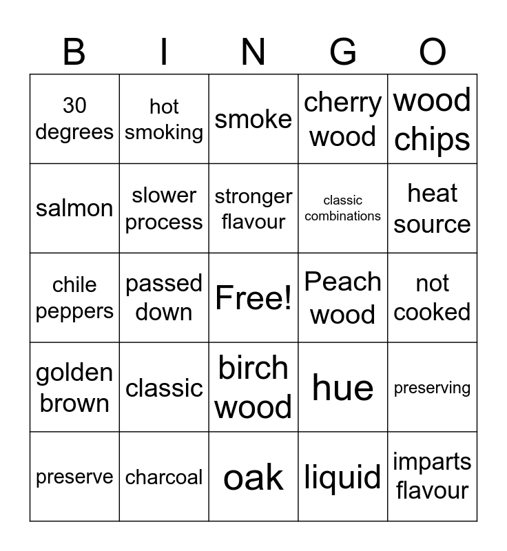 This bingo card has a free space and 44 words: bacterial, imparts flavour, drying, preserve, history, liquid, smoke, control, wood chips, charcoal, cherry wood, Peach wood, birch wood, classic, hickory, oak, mesquite, chile peppers, away from heat, heat source, hot smoking, cold smoking, moisture, 30 degrees, 160 degrees, not cooked, over smoke, half cooking time, hue, golden brown, oldest methods, preserving, meat, the world, passed down, sawdust, condenser, concentrated, stronger flavour, salmon, classic combinations, immediate eating, slower process and mahogany colour.