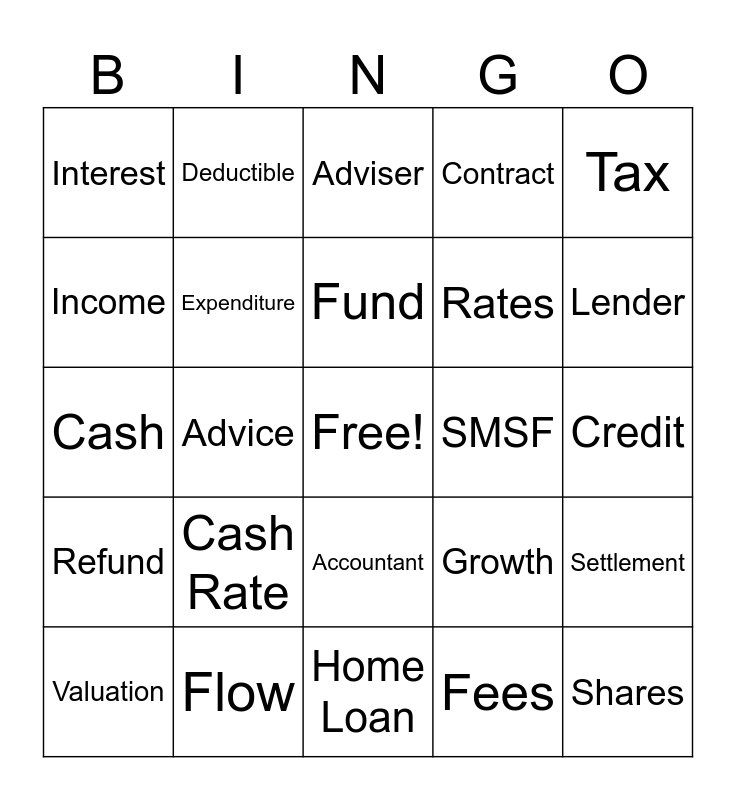 This bingo card has a free space and 50 words: Broker, Shares, Share market, Home Loan, Cash Rate, Interest Rate, Deductible, Bills, Income, Wealth, Expenditure, Contract, Settlement, Growth, Entity, Superannuation, Fund, SMSF, Dividends, Tax, Advice, Fees, Interest, Rates, Invest, Revenue, Lender, Bank, Adviser, Accountant, Return, Assets, Budget, Expenditure, Flow, Money, Shares, Deposit, Equity, Credit, Debt, Insurance, Borrow, Market, Valuation, Cash, Cash-flow, Repayment, Refund and Loans.