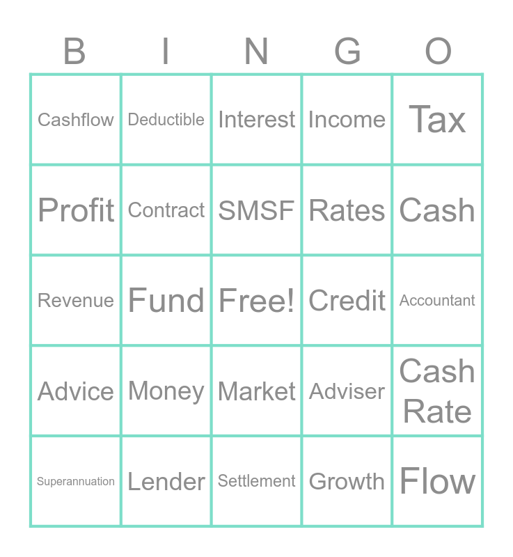 This bingo card has a free space and 49 words: Broker, Money, Share market, Home Loan, Cash Rate, Interest Rate, Deductible, Bills, Income, Wealth, Profit, Contract, Settlement, Growth, Entity, Superannuation, Fund, SMSF, Dividends, Tax, Advice, Fees, Interest, Rates, Invest, Revenue, Lender, Bank, Adviser, Accountant, Return, Assets, Budget, Expenditure, Flow, Shares, Deposit, Equity, Credit, Debt, Insurance, Borrow, Market, Valuation, Cash, Cashflow, Repayment, Refund and Loans.