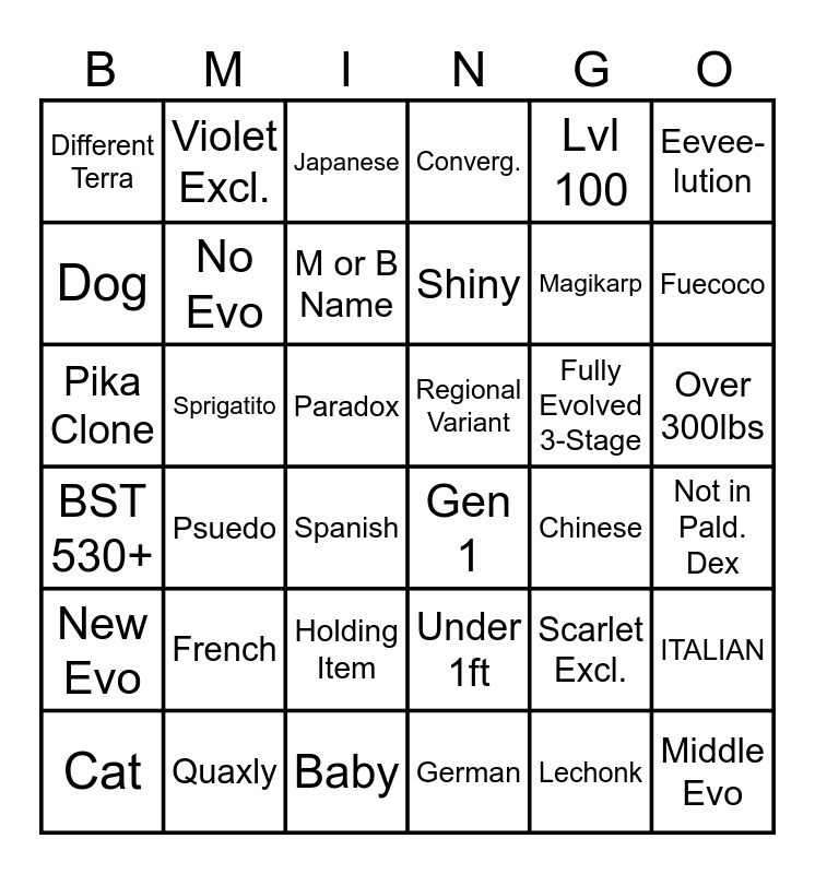 This bingo card has 36 words: Under 1ft, Holding Item, German, Dog, BST 530+, Regional Variant, No Evo, Baby, Lvl 100, Scarlet Excl., Fuecoco, Converg., ITALIAN, Sprigatito, Shiny, Different Terra, New Evo, Fully Evolved 3-Stage, Pika Clone, Japanese, Paradox, Psuedo, Gen 1, Spanish, Chinese, Violet Excl., Magikarp, Quaxly, M or B Name, Eevee- lution, Middle Evo, Cat, Not in Pald. Dex, Over 300lbs, French and Lechonk.