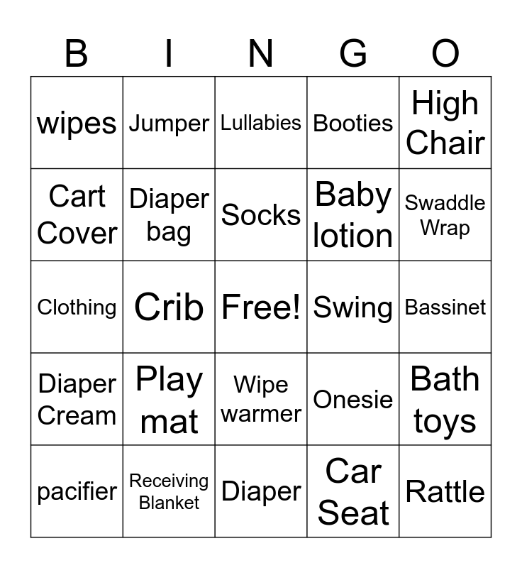 This bingo card has a free space and 55 words: Baby blanket, pacifier, Bottle, wipes, Diaper, Stroller, Diaper bag, Teether, Baby lotion, Baby Shampoo, Booties, Night Light, Headed Towel, Changing Pad, Stuffed Animal, Bib, High Chair, Crib, Baby Bath, Rattle, Swing, Late Night, Onesie, Lullabies, Spoon, Socks, Car Seat, Baby monitor, Bassinet, Bath toys, Book, Bottle warmer, Bouncer, Burp Cloth, Cart Cover, Clothing, Crib bedding, Diaper Cream, Nail Clippers, Humidifier, Jumper, Baby Tylenol, Mittens, Nursing Pillow, Play mat, Receiving Blanket, Shoes, SleepSack, Baby Sling/carrier, Swaddle Wrap, Rocking Chair, Thermometer, Wash cloths, Wipe warmer and Diaper genie.