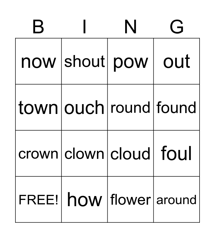 This bingo card has 16 words: how, foul, pow, now, crown, shout, cloud, flower, town, ouch, FREE!, out, clown, found, round and around.