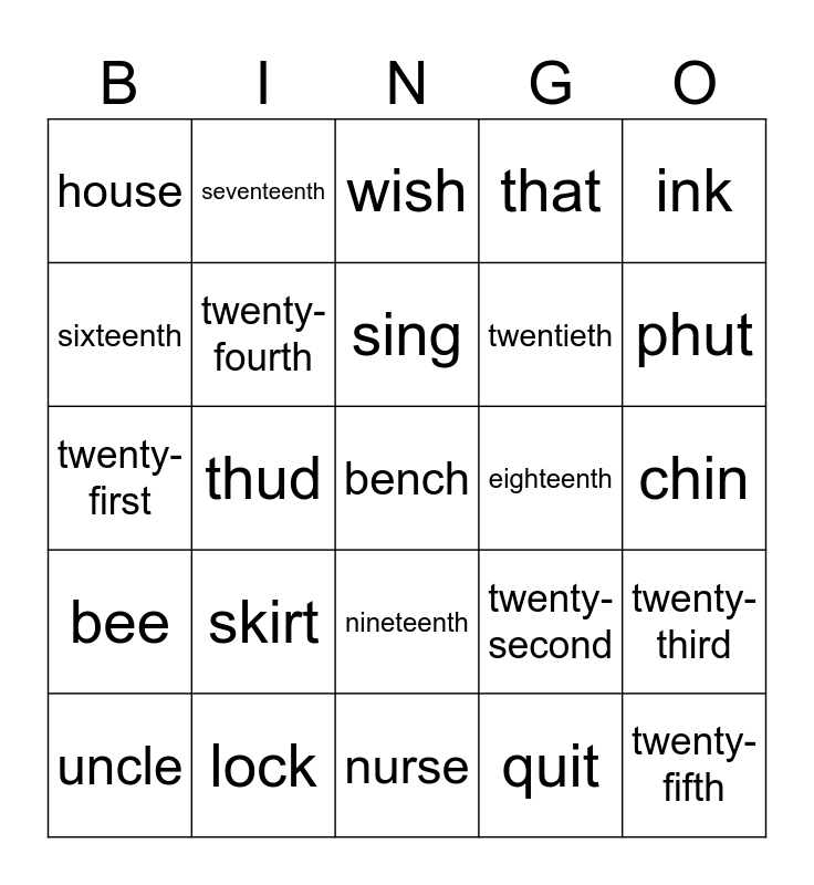 This bingo card has 25 words: skirt, nurse, sing, uncle, ink, house, sixteenth, seventeenth, eighteenth, nineteenth, twentieth, twenty-first, twenty-second, twenty-third, twenty-fourth, twenty-fifth, chin, wish, phut, thud, bench, lock, bee, that and quit.