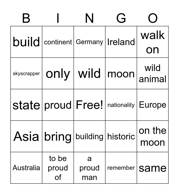 This bingo card has a free space and 24 words: bring, to be proud of, wild, Australia, walk on, build, skyscrapper, continent, nationality, building, moon, state, historic, on the moon, only, remember, Europe, Germany, wild animal, proud, same, Asia, Ireland and a proud man.