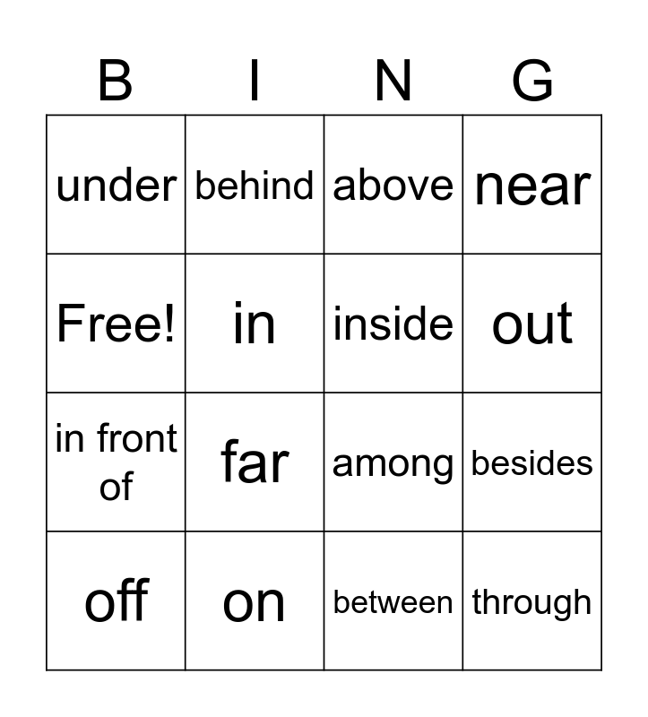 This bingo card has 16 words: on, besides, above, under, in front of, behind, among, between, Free!, in, off, near, far, out, inside and through.