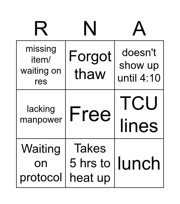 This bingo card has a free space and 11 words: Cant find item that is in the room, Takes 5 hrs to heat up, lunch, Waiting on protocol, Forgot thaw, doesn't show up until 4:10, TCU lines, didn't feel like it, lacking manpower, missing item/ waiting on res and Broken equipment.