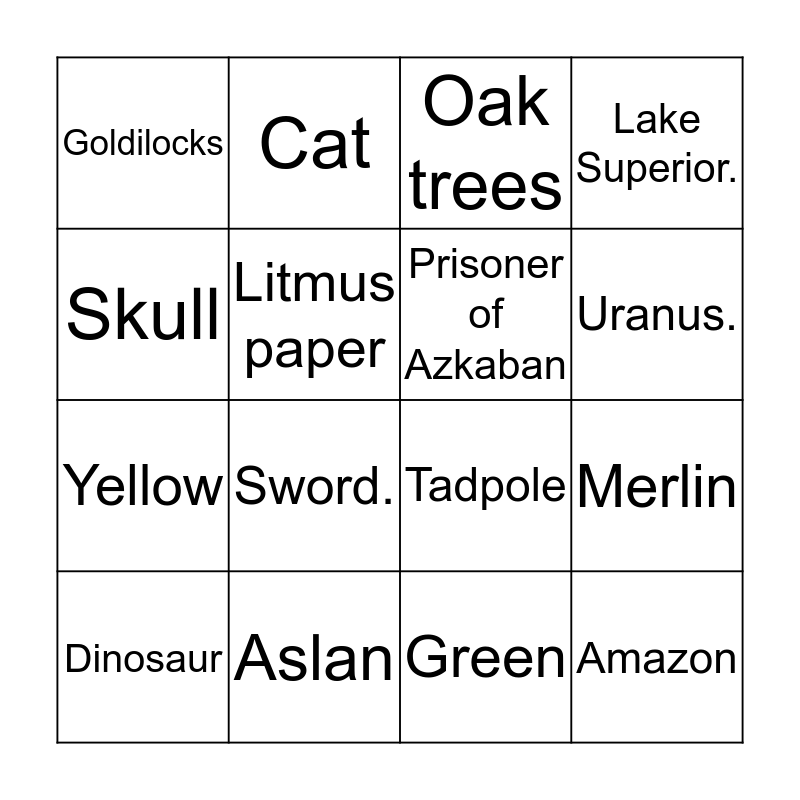 This bingo card has 16 words: Aslan, Merlin, Oak trees, Goldilocks, Yellow, Cat, Tadpole, Green, Skull, Litmus paper, Dinosaur, Lake Superior., Sword., Uranus., Prisoner of Azkaban and Amazon.