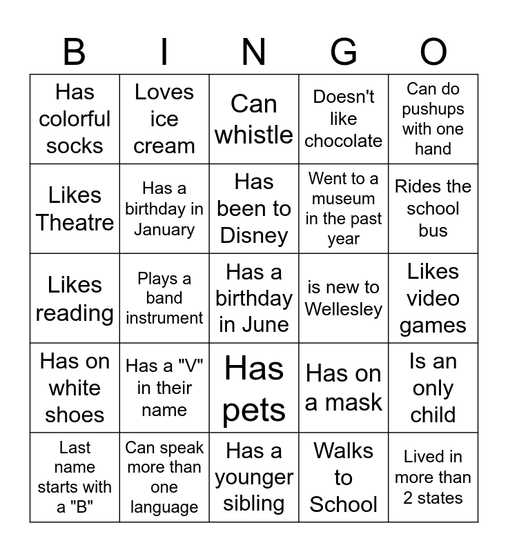This bingo card has a free space and 29 words: Last name starts with a "B", Was born in Florida, Plays a band instrument, Plays soccer, Has colorful socks, Can whistle, Has a birthday in January, Has a "V" in their name, is new to Wellesley, Can speak more than one language, Likes video games, Lived in more than 2 states, Has a younger sibling, Walks to School, Rides the school bus, Likes art, Has pets, Has on white shoes, Can do pushups with one hand, Likes reading, Has on a mask, Has an older sibling, Went to a museum in the past year, Likes Theatre, Doesn't like chocolate, Loves ice cream, Is an only child, Has been to Disney and Likes to watch TV.