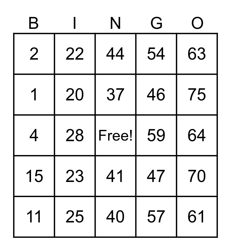 This bingo card has a free space and 24 words: 11, 23, 37, 57, 63, 2, 22, 44, 59, 64, 4, 20, 47, 70, 1, 25, 40, 54, 75, 15, 28, 41, 46 and 61.