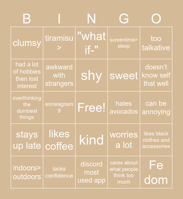 This bingo card has a free space and 24 words: likes coffee, lacks confidence, shy, indoors> outdoors, too talkative, clumsy, had a lot of hobbies then lost interest, tiramisu >, hates avocados, kind, sweet, overthinking the dumbest things, worries a lot, likes black clothes and accessories, awkward with strangers, cares about what people think too much, can be annoying, "what if-", doesn’t know self that well, enneagram 9, Fe dom, stays up late, screentime> sleep and discord most used app.