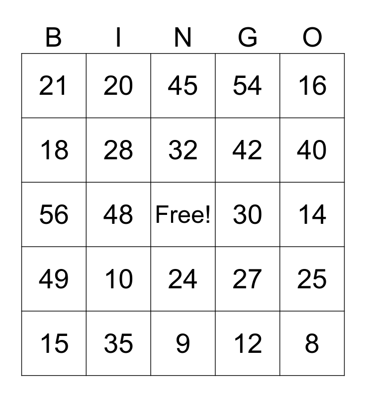 This bingo card has a free space and 24 words: 10, 35, 32, 15, 16, 21, 18, 20, 30, 24, 42, 56, 27, 25, 28, 12, 14, 45, 40, 48, 8, 49, 54 and 9.