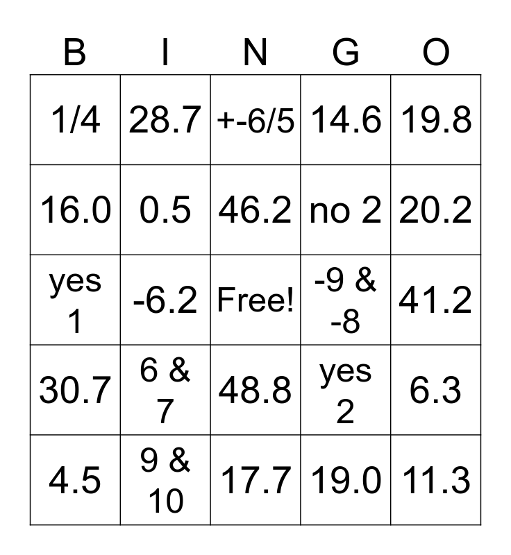 This bingo card has a free space and 29 words: 4.5, 8.5, -6.2, 7, 1/4, +-6/5, 0.5, 6 & 7, -9 & -8, 9 & 10, 41.2, 11.3, 17.7, 19.0, 20.2, 9.4, 48.8, 30.7, 19.8, yes 1, yes 2, no 1, no 2, 16.0, 14.6, 28.7, 6.3, 46.2 and 12.8.