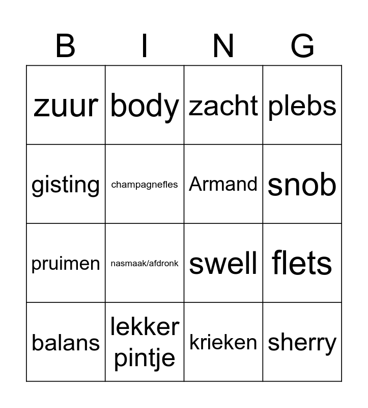 This bingo card has 16 words: lekker pintje, flets, zacht, zuur, pruimen, body, swell, krieken, gisting, champagnefles, balans, plebs, nasmaak/afdronk, snob, Armand and sherry.