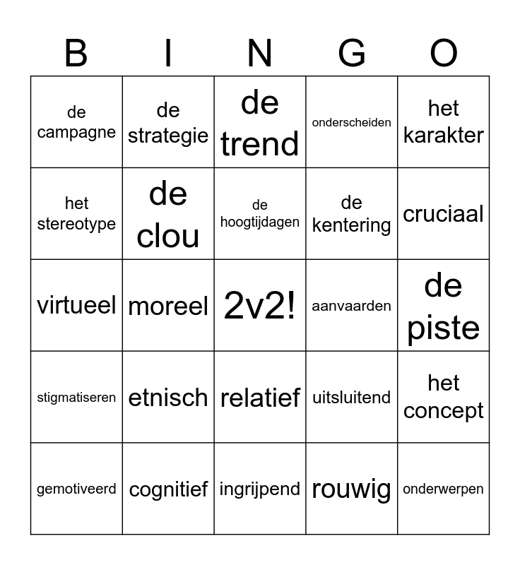 This bingo card has a free space and 38 words: absurd, associëren met, de betrekking, de clou, het concept, etnisch, de hoogtijdagen, introduceren, het karakter, de kentering, moreel, onderscheiden, onderwerpen, de piste, het stereotype, stigmatiseren, de superioriteit, de trend, volstrekt, aanvaarden, de campagne, cognitief, cruciaal, gemotiveerd, het imago, ingrijpend, het mechanisme, de metafoor, de motivatie, non-verbaal, optreden, relatief, rouwig, de strategie, de tactiek, uitsluitend, virtueel and zich committeren aan.