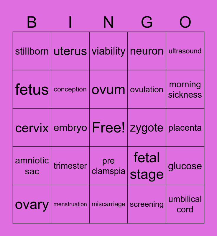 This bingo card has a free space and 24 words: ovary, trimester, ovum, screening, ultrasound, stillborn, uterus, viability, zygote, placenta, cervix, conception, fetal stage, glucose, fetus, menstruation, miscarriage, neuron, morning sickness, amniotic sac, embryo, pre clamspia, ovulation and umbilical cord.