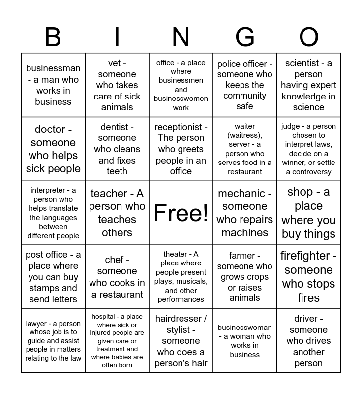 This bingo card has a free space and 50 words: cleaner / janitor - someone who cleans, driver - someone who drives another person, sales assistant - someone who sells things, hairdresser / stylist - someone who does a person's hair, chef - someone who cooks in a restaurant, gardener - someone who works with plants, vet - someone who takes care of sick animals, actor - someone who performs on a stage, TV show, or movie, doctor - someone who helps sick people, nurse - someone who helps doctors care for sick people, dentist - someone who cleans and fixes teeth, police officer - someone who keeps the community safe, firefighter - someone who stops fires, farmer - someone who grows crops or raises animals, construction worker - a person who builds buildings, artist - a person who creates art, receptionist - The person who greets people in an office, mechanic - someone who repairs machines, engineer - A person who designs, builds, or maintains engines, electronics, machines, or public works, scientist - a person having expert knowledge in science, teacher - A person who teaches others, businesswoman - a woman who works in business, businessman - a man who works in business, waiter (waitress), server - a person who serves food in a restaurant, electrician - a person who installs or repairs electrical or telephone lines, pilot - a person who flies a plane, judge - a person chosen to interpret laws, decide on a winner, or settle a controversy, farm - land that is used for growing crops or raising animals, office - a place where businessmen and businesswomen work, theater - A place where people present plays, musicals, and other performances, school - a place where children go to learn, laboratory - a place where scientists work and do experiments, restaurant - a building where people go to eat, construction site - a place where a building is being built, hospital - a place where sick or injured people are given care or treatment and where babies are often born, airport - a place where airplanes take off and land, court - A place where laws are interpreted and arguments are settled, auto shop - a place where mechanics work on cars, beauty salon, barbershop - a place to get your hair cut or styled, shop - a place where you buy things, garden - an place where plants (like flowers or vegetables) are grown, veterinary office - a place where people take care of sick animals, police station - the building where police officers work, often connected to a jail, accountant - a person who keeps or inspects financial records., lawyer - a person whose job is to guide and assist people in matters relating to the law, interpreter - a person who helps translate the languages between different people, model - someone who is paid to wear clothing, jewelry, etc., so that people will see and want to buy what is being worn, postal worker - someone who delivers the mail or works in the post office, post office - a place where you can buy stamps and send letters and soldier - a person who serves in an army.
