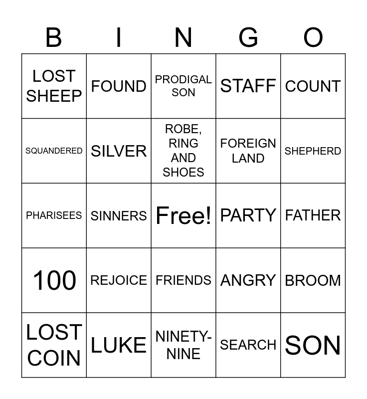 This bingo card has a free space and 29 words: LOST COIN, TAX COLLECTORS, SINNERS, PARABLES, LOST SHEEP, PRODIGAL SON, SILVER, REJOICE, PARTY, LUKE, FATHER, SON, NINETY-NINE, SEARCH, SHEPHERD, LOVE, FRIENDS, 100, COUNT, PHARISEES, ANGRY, HIRED HAND, FOREIGN LAND, SQUANDERED, STAFF, FOUND, BROOM, ROBE, RING AND SHOES and LOST SON.