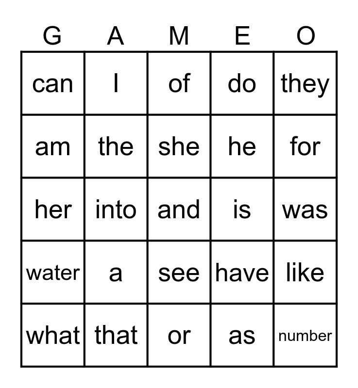 This bingo card has a free space and 24 words: a, that, she, what, they, can, am, I, is, see, he, her, have, like, the, as, was, of, for, into, number, water, do and or.