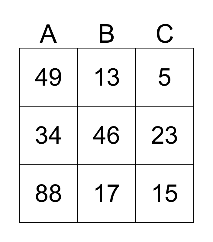 This bingo card has 9 words: 88, 5, 13, 34, 49, 23, 46, 15 and 17.