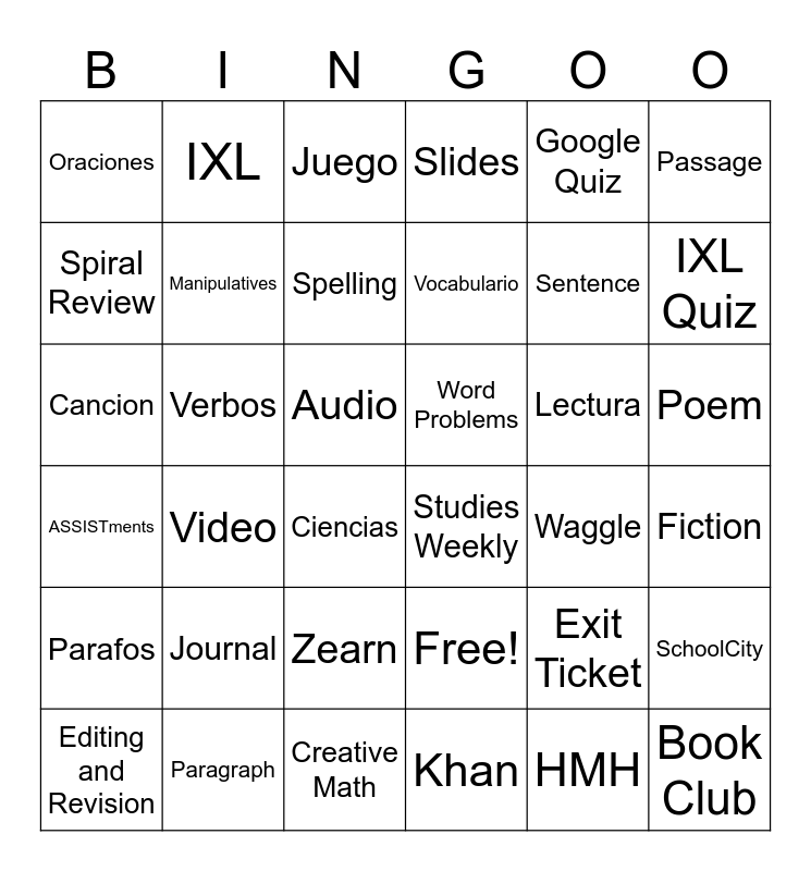 This bingo card has 36 words: Free!, Zearn, Khan, Spiral Review, ASSISTments, Word Problems, Manipulatives, Creative Math, Google Quiz, Exit Ticket, IXL Quiz, Slides, SchoolCity, Verbos, Vocabulario, Oraciones, Parafos, Lectura, Cancion, Juego, Audio, Video, Studies Weekly, Ciencias, Waggle, IXL, Sentence, Paragraph, Spelling, Passage, Book Club, Editing and Revision, Fiction, Poem, Journal and HMH.
