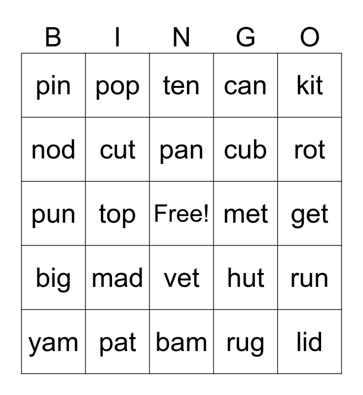 This bingo card has a free space and 24 words: mad, pat, pan, yam, kit, pin, nod, pop, met, vet, cub, pun, hut, run, cut, rug, get, ten, rot, top, lid, big, can and bam.