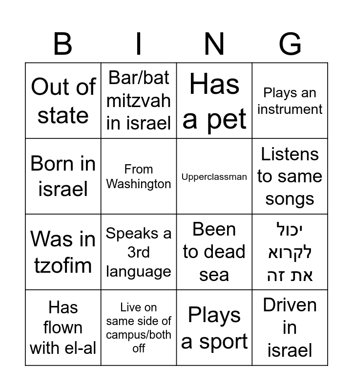 This bingo card has 24 words: Left handed, Same major, Listens to same songs, Both watched same TV show, Born in israel, Out of state, From Washington, Bar/bat mitzvah in israel, Live on same side of campus/both off, Free!, Was in tzofim, Been to dead sea, Thinks shoko is the best., Actually Likes matzah, Upperclassman, Travelled this summer, Plays a sport, Has a pet, Speaks a 3rd language, יכול לקרוא את זה, Has flown with el-al, Driven in israel, Plays an instrument and Same favorite pita topping/filling/spread.