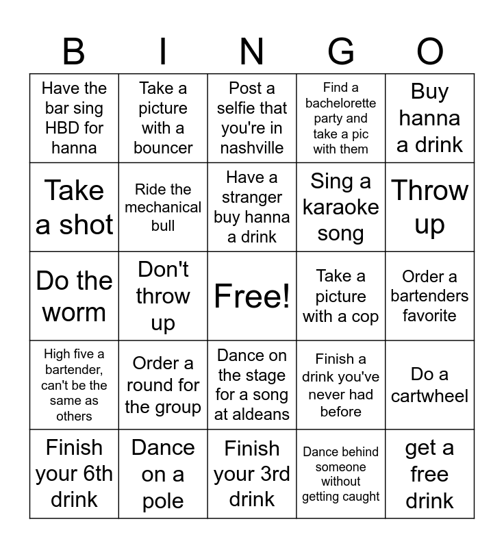 This bingo card has a free space and 25 words: Order a round for the group, Finish your 3rd drink, Have a stranger buy hanna a drink, Finish your 6th drink, Buy hanna a drink, Have the bar sing HBD for hanna, Take a shot, Take a picture with a bouncer, Take a picture with a cop, Dance on the stage for a song at aldeans, Sing a karaoke song, Do the worm, Finish a drink you've never had before, Do a cartwheel, Ride the mechanical bull, Drink a shot with a straw, Order a bartenders favorite, Post a selfie that you're in nashville, Throw up, Don't throw up, get a free drink, Dance on a pole, High five a bartender, can't be the same as others, Find a bachelorette party and take a pic with them and Dance behind someone without getting caught.