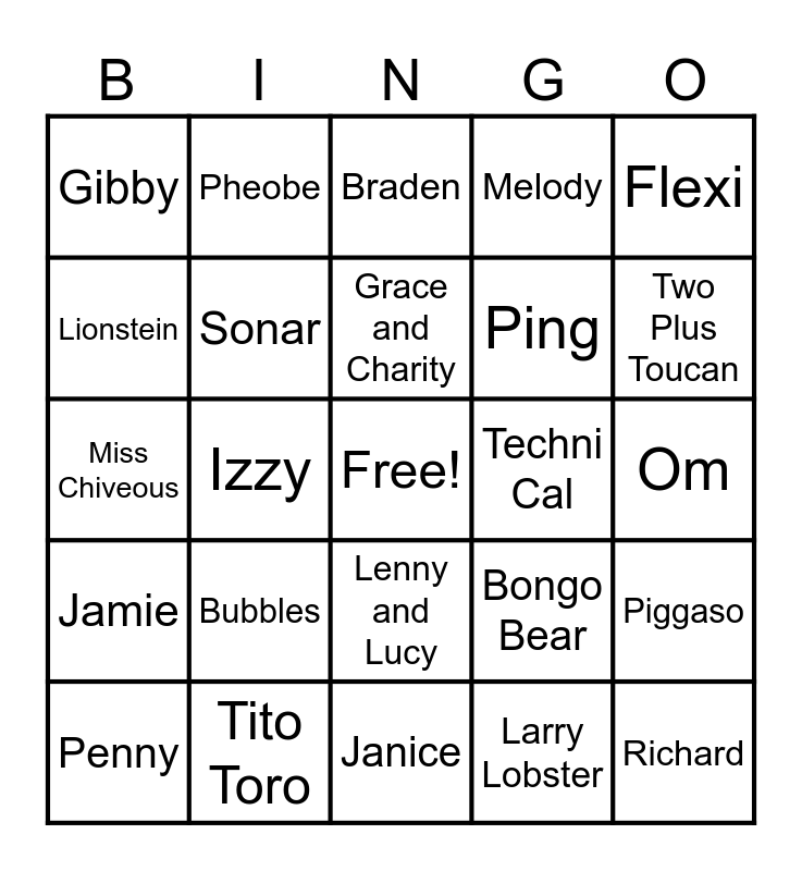 This bingo card has a free space and 24 words: Bubbles, Tito Toro, Grace and Charity, Penny, Flexi, Gibby, Lionstein, Pheobe, Techni Cal, Lenny and Lucy, Ping, Miss Chiveous, Bongo Bear, Piggaso, Sonar, Larry Lobster, Om, Braden, Two Plus Toucan, Izzy, Richard, Jamie, Melody and Janice.