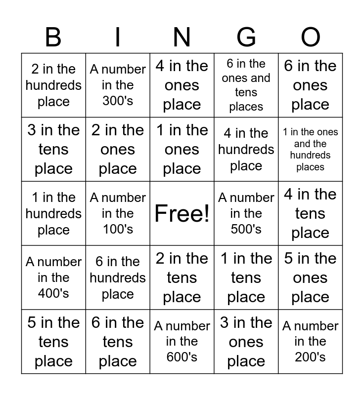 This bingo card has a free space and 24 words: 6 in the hundreds place, 6 in the tens place, 1 in the ones place, 5 in the tens place, 6 in the ones place, 2 in the hundreds place, 3 in the tens place, A number in the 300's, A number in the 500's, 2 in the tens place, 4 in the hundreds place, 1 in the hundreds place, 1 in the tens place, 5 in the ones place, 2 in the ones place, 3 in the ones place, 4 in the tens place, 4 in the ones place, 1 in the ones and the hundreds places, A number in the 100's, A number in the 200's, A number in the 400's, 6 in the ones and tens places and A number in the 600's.