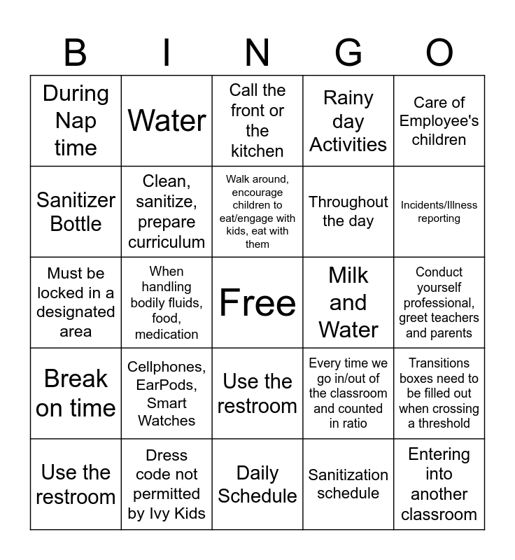 This bingo card has a free space and 24 words: Cellphones, EarPods, Smart Watches, Dress code not permitted by Ivy Kids, Walk around, encourage children to eat/engage with kids, eat with them, Use the restroom, Care of Employee's children, During Nap time, Sanitizer Bottle, Water, Milk and Water, Use the restroom, Throughout the day, Must be locked in a designated area, Every time we go in/out of the classroom and counted in ratio, Transitions boxes need to be filled out when crossing a threshold, Clean, sanitize, prepare curriculum, Sanitization schedule, Conduct yourself professional, greet teachers and parents, Call the front or the kitchen, Incidents/Illness reporting, When handling bodily fluids, food, medication, Entering into another classroom, Break on time, Rainy day Activities and Daily Schedule.