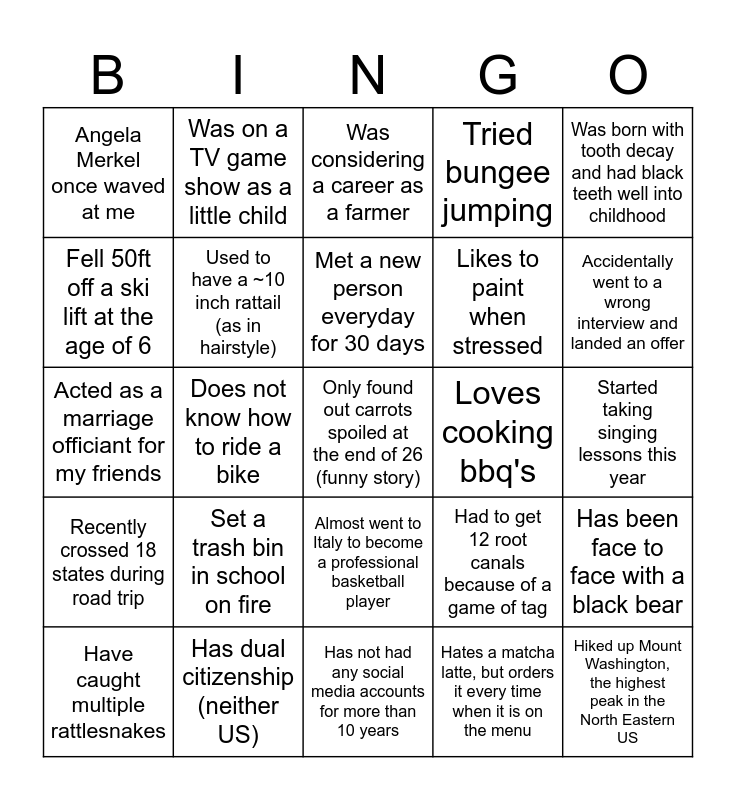 This bingo card has a free space and 24 words: Set a trash bin in school on fire, Has dual citizenship (neither US), Met a new person everyday for 30 days, Have caught multiple rattlesnakes, Was born with tooth decay and had black teeth well into childhood, Angela Merkel once waved at me, Fell 50ft off a ski lift at the age of 6, Was on a TV game show as a little child, Loves cooking bbq's, Almost went to Italy to become a professional basketball player, Likes to paint when stressed, Acted as a marriage officiant for my friends, Had to get 12 root canals because of a game of tag, Has been face to face with a black bear, Used to have a ~10 inch rattail (as in hairstyle), Hates a matcha latte, but orders it every time when it is on the menu, Started taking singing lessons this year, Was considering a career as a farmer, Accidentally went to a wrong interview and landed an offer, Does not know how to ride a bike, Hiked up Mount Washington, the highest peak in the North Eastern US, Recently crossed 18 states during road trip, Tried bungee jumping and Has not had any social media accounts for more than 10 years.