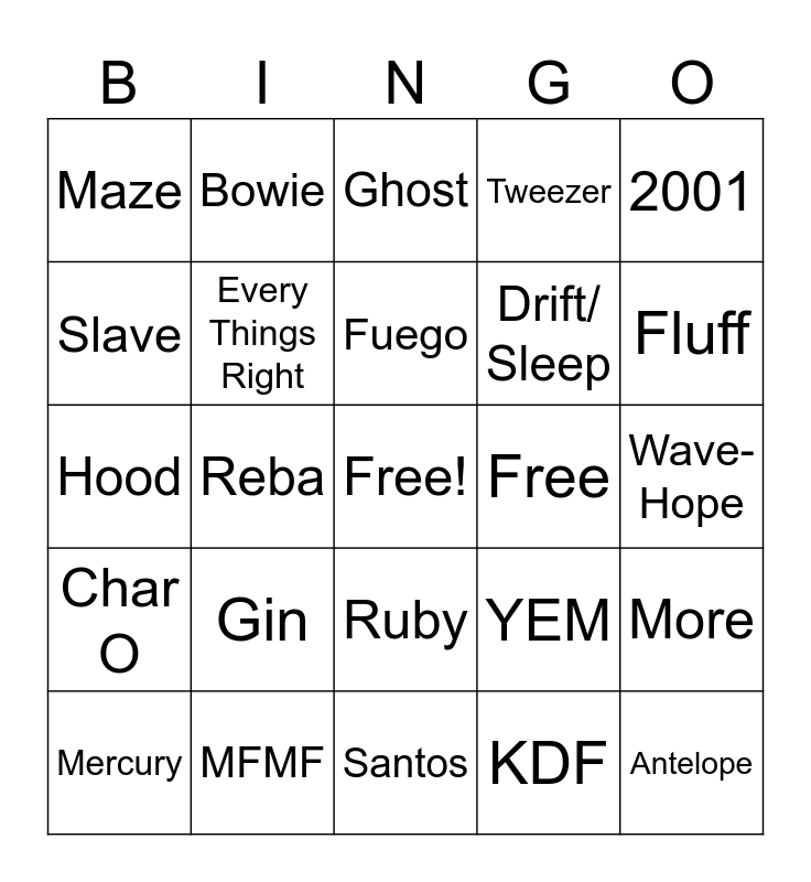 This bingo card has a free space and 24 words: Gin, MFMF, Fuego, Mercury, 2001, Maze, Slave, Bowie, Free, Ruby, Drift/ Sleep, Hood, YEM, More, Every Things Right, KDF, Wave- Hope, Ghost, Fluff, Reba, Antelope, Char O, Tweezer and Santos.
