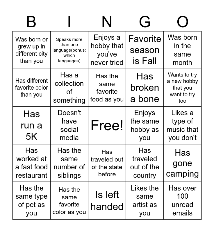 This bingo card has a free space and 24 words: Has the same number of siblings, Has the same favorite color as you, Has the same favorite food as you, Has the same type of pet as you, Was born in the same month, Was born or grew up in different city than you, Has different favorite color than you, Speaks more than one language(bonus: which languages), Enjoys the same hobby as you, Has traveled out of the state before, Has broken a bone, Has run a 5K, Has traveled out of the country, Has gone camping, Has a collection of something, Likes the same artist as you, Likes a type of music that you don't, Enjoys a hobby that you've never tried, Wants to try a new hobby that you want to try too, Doesn't have social media, Has over 100 unread emails, Has worked at a fast food restaurant, Favorite season is Fall and Is left handed.