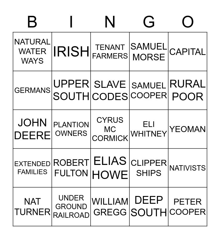 This bingo card has a free space and 24 words: ROBERT FULTON, UNDER GROUND RAILROAD, SLAVE CODES, NAT TURNER, CAPITAL, NATURAL WATER WAYS, GERMANS, IRISH, ELI WHITNEY, ELIAS HOWE, SAMUEL COOPER, JOHN DEERE, CLIPPER SHIPS, NATIVISTS, UPPER SOUTH, DEEP SOUTH, YEOMAN, TENANT FARMERS, RURAL POOR, PLANTION OWNERS, PETER COOPER, EXTENDED FAMILIES, SAMUEL MORSE and WILLIAM GREGG.