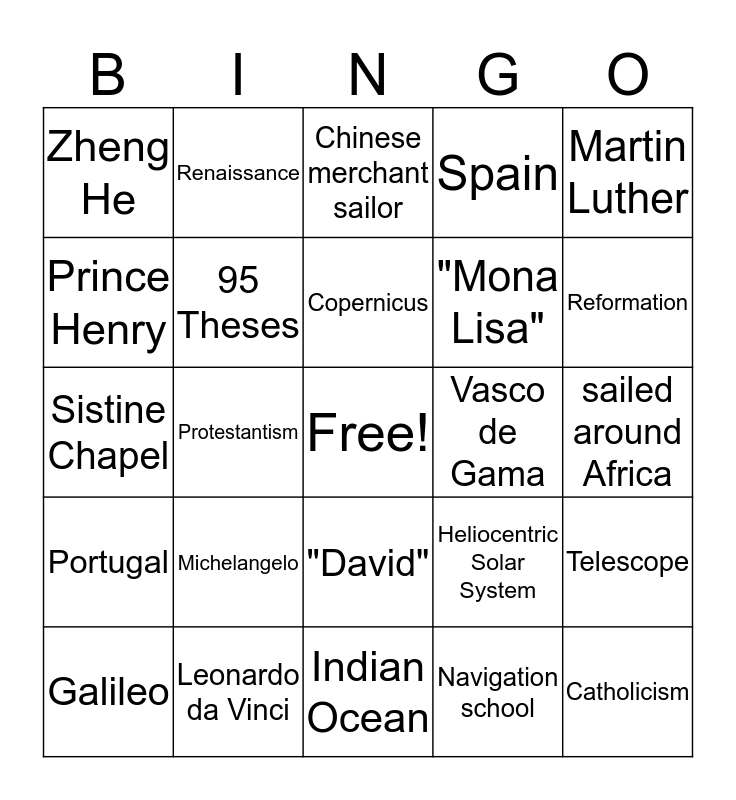 This bingo card has a free space and 24 words: Michelangelo, Leonardo da Vinci, Copernicus, Galileo, Martin Luther, Zheng He, Prince Henry, Renaissance, Vasco de Gama, "David", "Mona Lisa", Sistine Chapel, Heliocentric Solar System, Telescope, 95 Theses, Navigation school, sailed around Africa, Chinese merchant sailor, Reformation, Protestantism, Catholicism, Portugal, Spain and Indian Ocean.