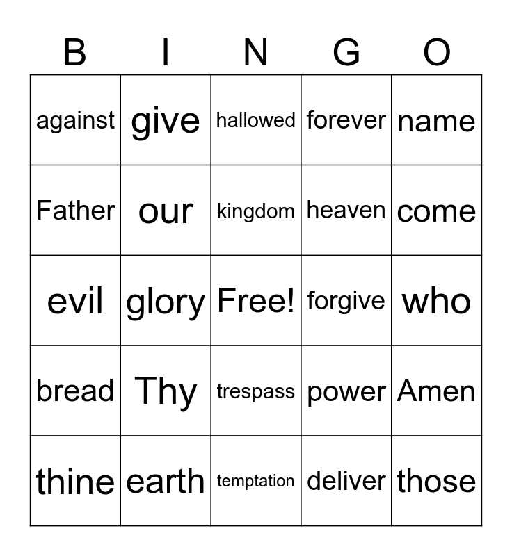 This bingo card has a free space and 32 words: deliver, lead, glory, will, bread, our, name, Amen, give, done, kingdom, hallowed, into, day, forgive, daily, thine, evil, trespass, Thy, power, we, who, earth, those, forever, heaven, Father, against, temptation, us and come.