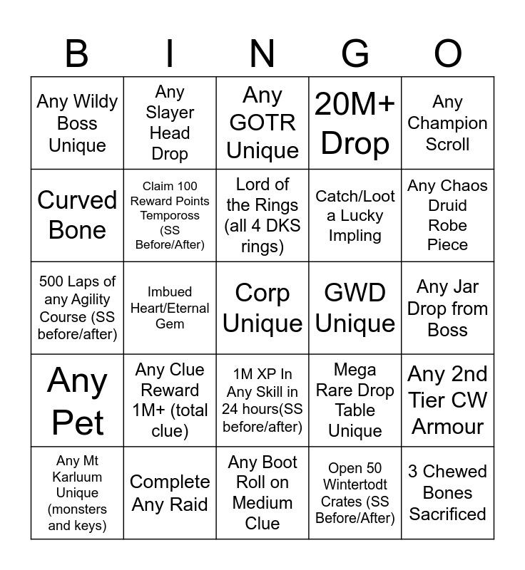 This bingo card has a free space and 24 words: Any Clue Reward 1M+ (total clue), Complete Any Raid, Lord of the Rings (all 4 DKS rings), Any Mt Karluum Unique (monsters and keys), Any Champion Scroll, Any Wildy Boss Unique, Curved Bone, Any Slayer Head Drop, GWD Unique, 1M XP In Any Skill in 24 hours(SS before/after), Catch/Loot a Lucky Impling, 500 Laps of any Agility Course (SS before/after), Mega Rare Drop Table Unique, Any 2nd Tier CW Armour, Claim 100 Reward Points Tempoross (SS Before/After), Open 50 Wintertodt Crates (SS Before/After), Any Jar Drop from Boss, Any GOTR Unique, Any Chaos Druid Robe Piece, Imbued Heart/Eternal Gem, 3 Chewed Bones Sacrificed, Any Pet, 20M+ Drop and Any Boot Roll on Medium Clue.