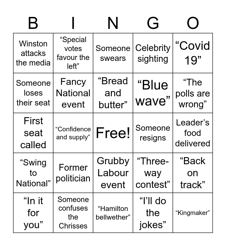This bingo card has a free space and 30 words: Someone confuses the Chrisses, “Neck and neck”, “Confidence and supply”, Dead air on a live cross, Winston attacks the media, Someone swears, Fancy National event, Grubby Labour event, Someone resigns, “Hamilton bellwether”, Leader’s food delivered, “Kingmaker”, “I’ll do the jokes”, Someone speaks Maori, “The polls are wrong”, Winston gets to 5%, “Three-way contest”, “Swing to National”, Former politician, “Covid 19”, First seat called, Electorate upset, “Special votes favour the left”, “Blue wave”, Someone loses their seat, Celebrity sighting, “Back on track”, “In it for you”, “Bread and butter” and “Tax cut”.