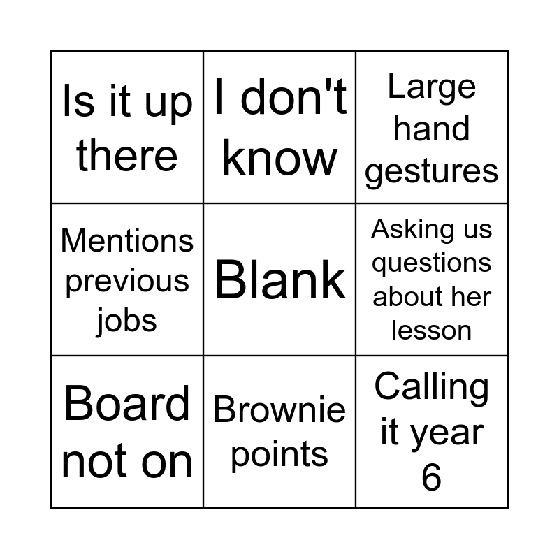 This bingo card has a free space and 21 words: Erm, Register?, I don't know, Okay?, Hambledon, Board not on, Is it up there, Large hand gestures, YEAHHHHHH (multiple), Brownie points, Walking round the room lots, Mentions previous jobs, Government comment, Putting her password in on screen, Asking us questions about her lesson, Sound effects, Trip over wire, Peewees, Calling it year 6, Death glare at someone and Snappy response.